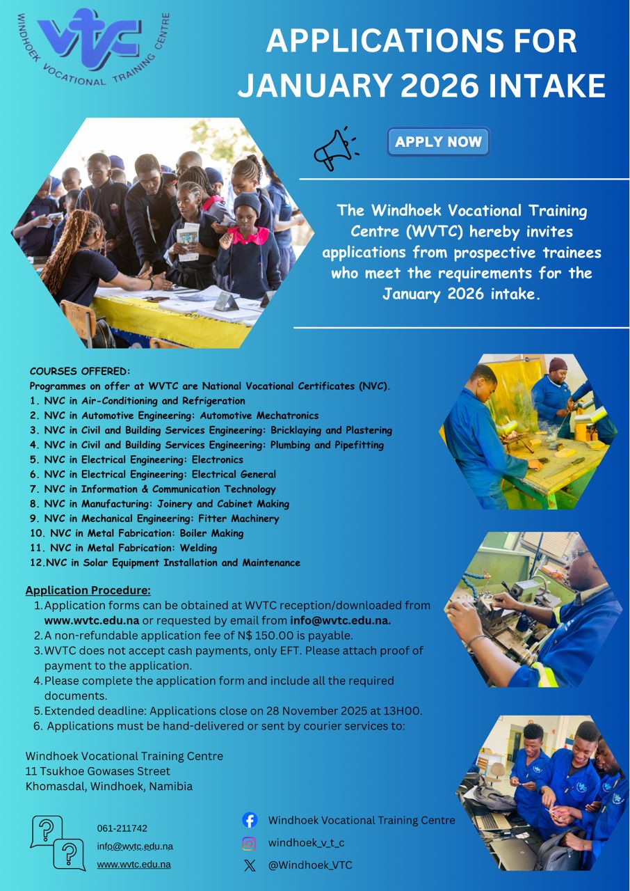 The Windhoek Vocational Training Centre (WVTC), is located in Windhoek the capital city of Namibia. WVTC is a flagship institution in the technical vocational education and training cluster. Our facilities, equipment, highly competent staff and social ambience give our trainees the necessary conditions for success in career development. We are committed to vocational training, which will equip Namibia with a skilled labour force that will drive socio-economic development and entrepreneurship. Since our inception, we have maintained steady growth in the number of course participants as well as the number of graduates fed into the market.